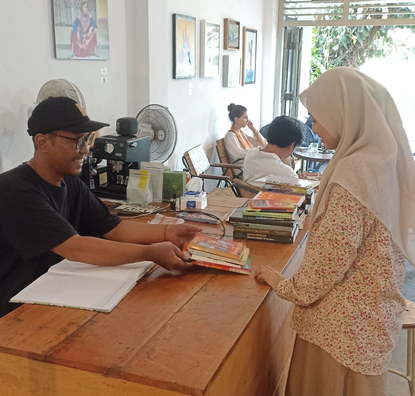Toko itu memiliki suasana yang hangat dan asri. Pintu masuknya terbuat dari kayu, dengan desain klasik yang memberi kesan ramah. Rak-rak buku yang tinggi dan penuh terorganisir dengan rapi, berbaris sepanjang ruangan, memadukan estetika vintage dengan nuansa natural. Tanaman hijau diletakkan dengan artistik di sudut-sudut ruangan, memberikan sentuhan hidup dan kesan segar.